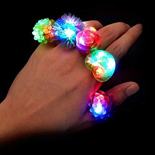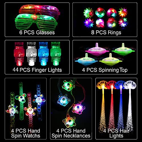PACKAGE INCLUDE:: 44 x Finger Lights 8 x Jelly Rings 6 x Flashing Glasses 4 x Hand Spin Bracelets 4 x Hand Spin Necklaces 4 x Hair Lights 4 x Spinning Top.Warning: Choking hazard!Small parts included. Parents must be careful!
