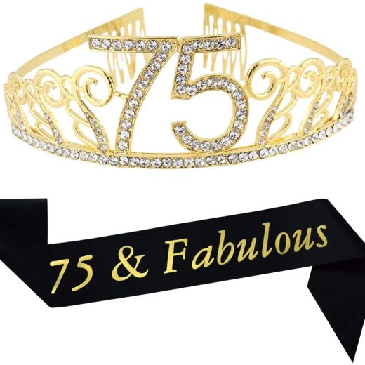 Super and cute happy birthday party supplies, favors, decorations for 75th Birthday. 75th Birthday is a special event. Birthday tiara and 75 & Fabulous black glitter satin sash will help you look fabulous, happy and have a lot of fun with your friends . Color: Black sash with gold font. Gold 75th birthday crown. Package: 1 x 75th birthday tiara 1 x 75 & Fabulous sash