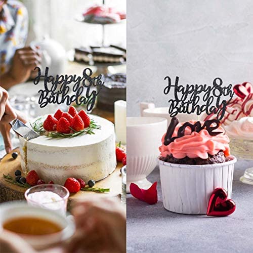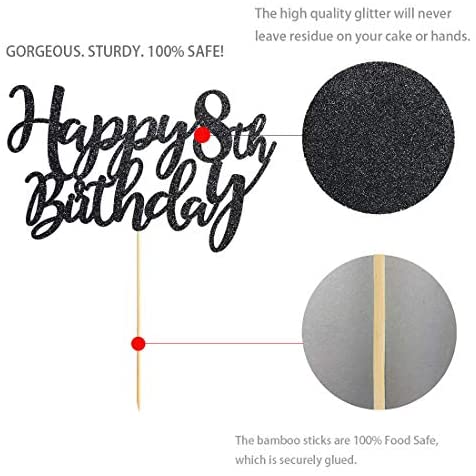 8 Black Glitter Happy 8th Birthday Cake Topper, Birthday Party Cake Topper Decorations, Supplies