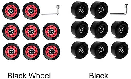 Features:Material — Made from durable polyurethane material, designed to provide good grip and speed in all hardnesses and has excellent durability.Size And Diameter — 58mm/2.28 in diameter, 32mm/1.26inch in width, equipped with bearings and spacer.82A Hardness — With 82A hardness, offering grip, speed and durability. These long lasting artistic wheels are competition quality and formulated to roll smoothly while providing a fantastic grip on the rink floor.Highlights — The inner and outer edges of the hub are oversized, which reduces the amount of urethane on the edges of the wheel. This makes it easy to perform stopsand offers excellent response. The middle of the hub has room for more urethane, which offers grip, increases control, and improves ride.Package Included — Pack of 8 wheels replacements and a wrench.Specifications:Item Type: Roller Skate WheelsMaterial: PUColor: Black Wheel, BlackHardness: 82AInner Buckle: PPBearing: High Speed608RSApplicable For: Double inline skating, skateboardingResilience: 80%Size: About 58 x 32mm/2.28 x 1.26inch(Dia. x W)Package Includes:8Pcs x Roller Skate Wheels1Pc x WrenchNotes:Transition: 1cm=10mm=0.39inch1. Due to the different monitor and light effect, the actual color of the item might be slightly different from the color showed on the pictures. Thank you!2. Please allow 1-3cm measuring deviation due to manual measurement.