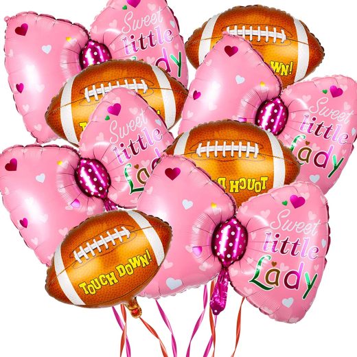 Package contents: there are 8 beautiful gender reveal balloons, including 4 pink bow balloons and 4 football balloons; With sufficient quantity and different designs, these baby shower balloons can meet your decorative needs and make it easier for you to hold an amazing and joyful party Easy to use: the pink bow balloons and cool football balloons are designed to seal automatically after inflation, with no need for additional operation, which are easy to use and reusable for next parties; If you need to release the gas, a straw can do that for your convenience Fun and cute design: the combination of football and bow is suitable for all ages, the football stands for boys and the bow stands for girls; The balloons are designed with lovely shapes in vivid colors, intended for a variety of parties to add a cheerful atmosphere Size details: each foil pink balloon is approx 30 x 18 inches in size, while the football balloon is approx 36 x 33 inches. Their large sizes and vibrant colors can quickly attract your guests attention, they are also lightweight and convenient to inflate and hang Kindly remind: the balloon cant float after it is filled with helium; You can fix it with rope or tape; The color difference may occur after inflation, but its color effect will be nicer; Please keep the balloons away from heat, fire or anything pointed