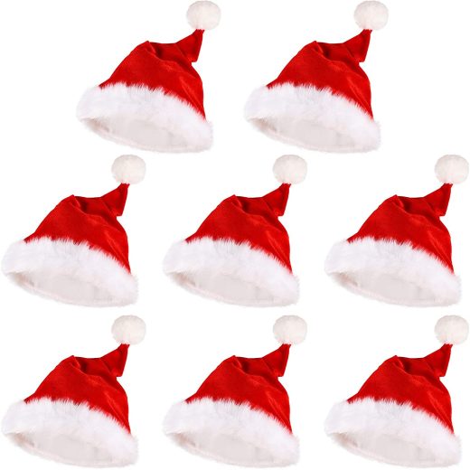 Christmas accessories:The plush Christmas hat consists of red body and a plush white cuff, with a matching white pom on top, look lovely and festive, great accessory for wearing on the holidays to complete your Santa costume.Enhance festive atmosphere:The Christmas plush Santa hat can add festival atmosphere and bring fun to your party, greatly enhance festive atmosphere, making you look more attractive and catch other peoples eyes. Not easy to break and deform, ensure long-lasting wear.Comfortable to wear:The Christmas hat adopts quality plush material, soft and not scratchy, provides you with comfortable wearing experience. Suitable for both children and adults wear.Specification:Color: redSize: 11.81 x 16.14 inches (W x H)Material: plushPackage includes:8 x Christmas plush Santa hatsWarm tip:The white plush of the Christmas hat may be colored with the red color.