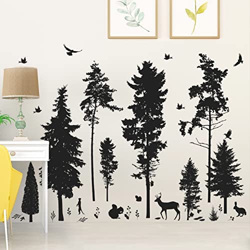 8 Sheets 3D Black Tree Wall Stickers Animal Jungle Trees Wall Decals Pine Evergreen Tree Wall Sticker Squirrel Birds Deer Rabbit DIY Removable Premium Black Vinyl Sticker for Kids Girl Boy Bedroom Living Room Nursery Rooms Home Office Walls Decor
