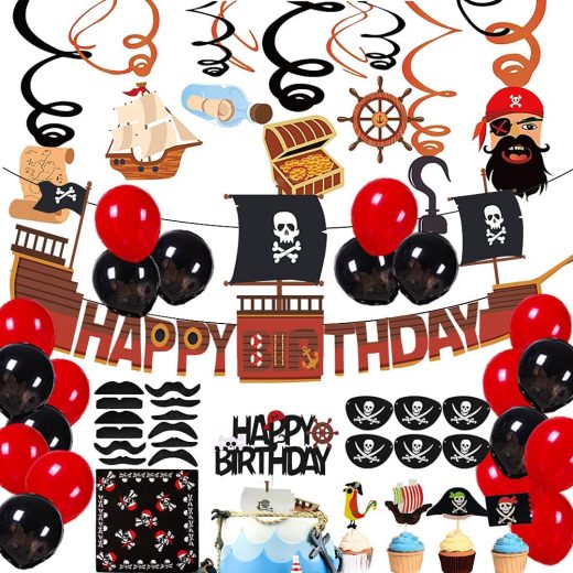 Pirate Themed Birthday Decorations Party Supplies Include Happy Birthday Banner Hanging Swirls Balloons Eye Mask Mustaches Cupcake Toppers Headband…