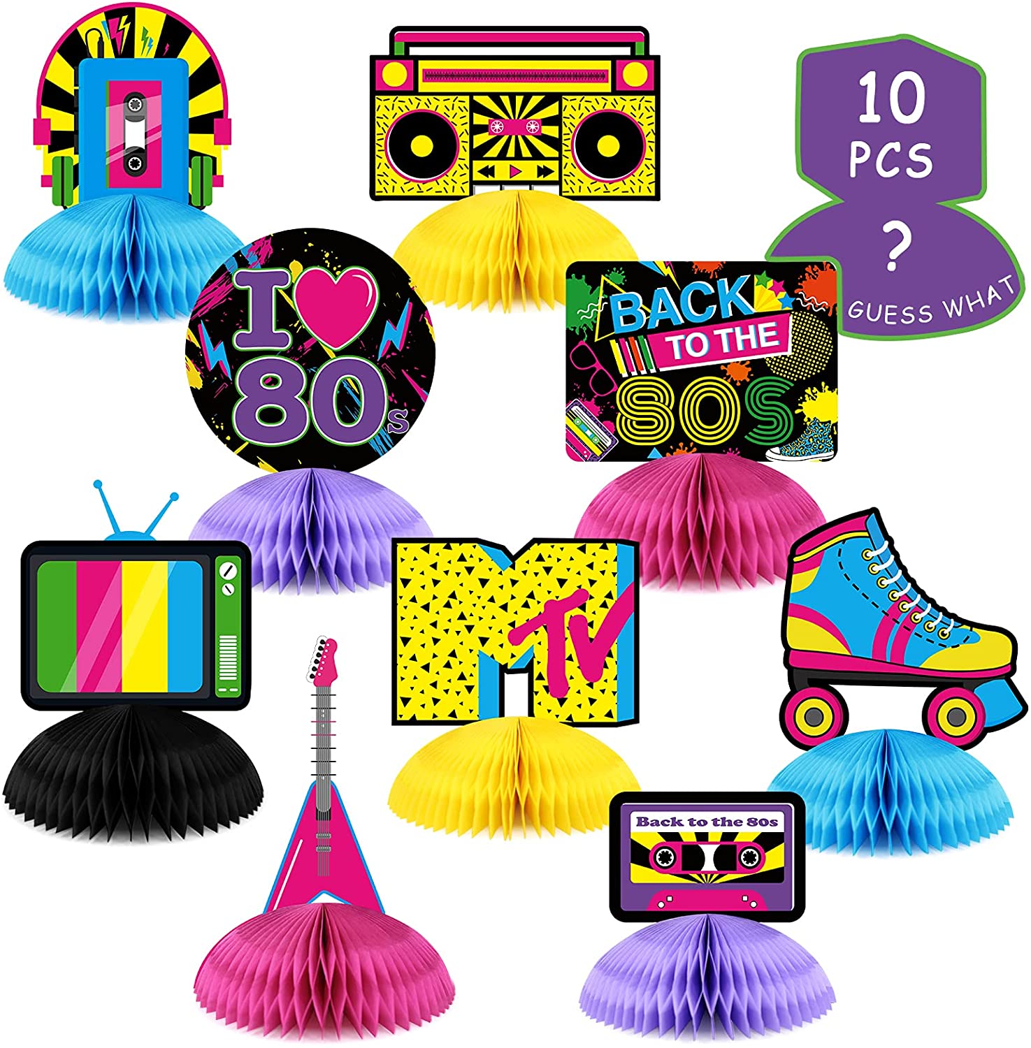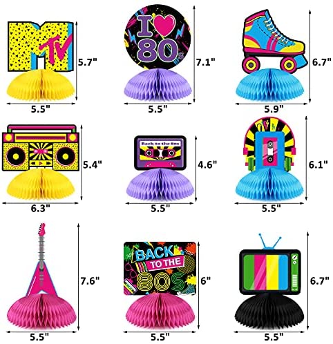 BACK TO THE 80S PARTY DECORATIONS – Decorate and accessorize your retro party with these 80s theme party decorations and create beautiful memories. These back to the 80s decorations are ideal for various occasions! Perfect for birthday, wedding, bachelorette party, bridal shower, or anniversary celebrations. These 80s theme birthday party centerpieces will add a fun touch to your party. PERFECT AMOUNT AND SUITABLE SIZE – You will receive 10 pieces DOUBLE-SIDED card stock with honeycomb bases. These back to the 80s birthday party centerpieces are made of thick cardstock paper and delicate printing technology, durable,light and fade-free. Each centerpiece is approx 5.5 in width. EASY TO ASSEMBLE – We know you have your hands full with planning the party, so we already did the hard part by gluing cardstocks and honeycomb orbs together. Just take a couple of seconds to finish the remaining part according to the picture, then put it on your favorite display area. Super easy to decorate your party and save you time. GREAT REUSABLE SOUVENIR – Our 80s neon party centerpieces are made of high-quality cardstock and honeycomb orbs and we combine them to be a completed one carefully. It can be used after the party as souvenirs to decorate your house. A LITTLE SUPPLIES – Guess what is your 10th back to the 80s centenpieces
