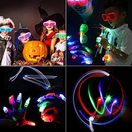 ABUNDANT 84 VARIETY CHRISTMAS GLOW IN THE DARK PARTY FAVOR SUPPLIES48 Finger Lights, 6 Light Up Bracelet, 6 Flashing Glasses, 6 Whistle, 6 Luminous Stickers, 6 Slingshot, 6 Bamboo Dragonfly for Party Birthday Celebration Halloween Party,Each light up toys can shine colorfully and bright enough to attract anyones sights, light up your mood or party atmosphere. 48 LED FINGER LIGHTSSuper Bright in 4 Colors (Blue, Green, White and Red). Finger Lights Designed with Elastic Strap for Any Fingers, Pens or Other Objects. Light up tops with bracelet. It comes in various colors and styles. A fun cartoon pattern combination of bracelet,3 FLASHING MODES – fast blink, super bright blink & blink with different colors in turn. 6 FLASHING GLASSESThese kids party favors have 6 Flashing Glasses, blue, green, red and white. Three flash modes are also provided. The first type of flash:If you press the switch once, the light will blink continuously . The second type of flash:If you press it again, the light will blink very quickly. The third type of flash:If you press it the third time, the three LED lights will first blink in turn and then blink quickly . If you press it the fourth time, the switch will be turned off. 6 WHISTLEThe whistle will light up with the push of a button, playing this light up whistle in the dark is very interesting and attractive6 SHEETS KID TEMPORARY TATTOO STICKERSThe stickers include Halloween pumpkins, ghost heads, bats, etc. All are Children favorite theme tattoos, they will needs a good few minutes of activation by light before they will Glow in the Dark.Durable They Glow in the Dark long last for 3-5 days. 6 SLINGSHOT LED HELICOPTERS LAUNCHES LIKE A ROCKET , Launches up to 120 feet in the air with included launchers. Perfect gift for boy girls People always like sparkling things. This is like their playing playground, full of fun. Every beam of light is their childhood memory. Hope every boy girls who owns this set of light up toys will always shiny and happy. Super suitable for birthday party, Christmas, Halloween.