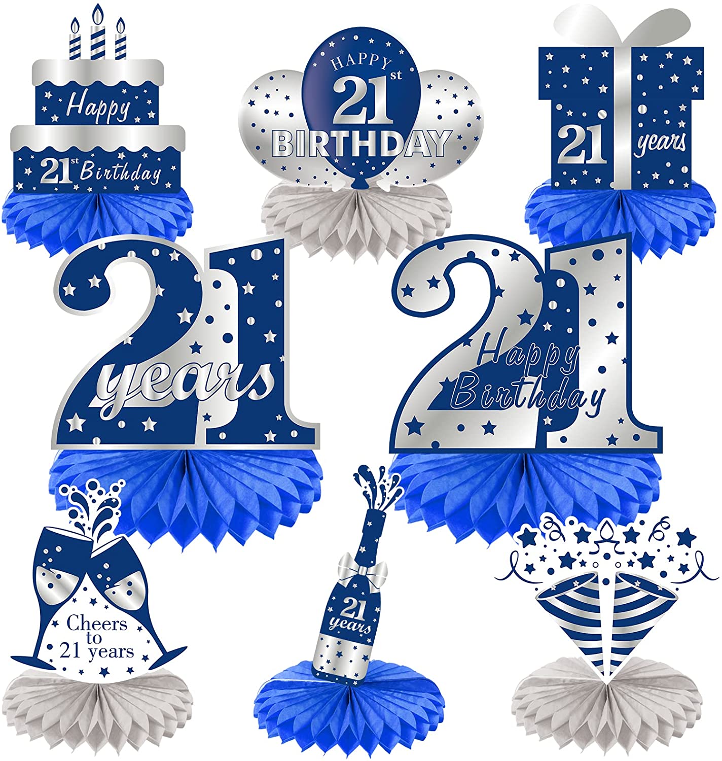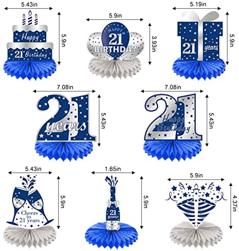 8Pcs 21st Birthday Honeycomb Centerpieces Decorations for Boys, Blue Silver Happy 21 Birthday Table Centerpiece Party Supplies, Birthday,Twenty First Year Old Table Topper Decor Sign