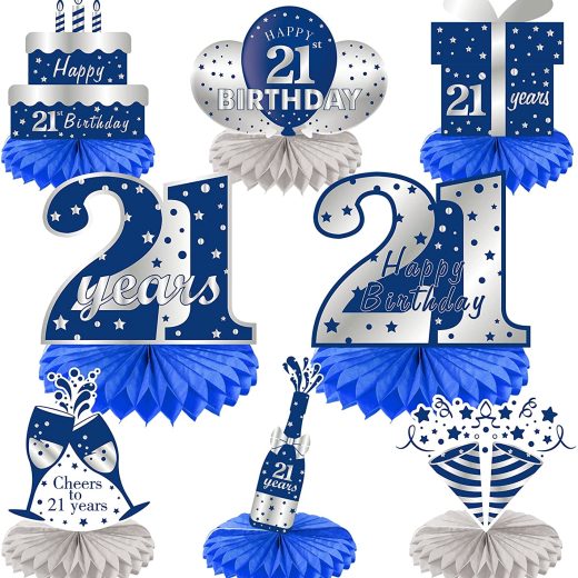 [You will get] – 8pcs 21 year old birthday-themed party table decorations in blue and silver, including 8 21-year-old birthday pattern paper and 8 paper honeycomb balls. [Unique design] – The unique blue and silver design, with exquisite and rich 21st birthday party elements, such as cakes, balloons, gifts, fireworks, etc., creates a strong 21st birthday party atmosphere, which is impressive and is decorated for 21 years old The best choice for birthdays. [Suitable for] – Very suitable for 21st birthday themed parties, you can put it on the dining table, dessert table, etc. as decoration, or as a photo background prop to record a beautiful moment. [Easy to install] – Each card is marked with the area where the honeycomb can be assembled. First remove the sticker on the honeycomb ball, then paste the honeycomb ball to the fixed area on the card, and finally repeat the above steps on the other side of the card. [High-quality materials] – Using high-quality paper materials, the printing is clear, durable, light and not easy to fade.