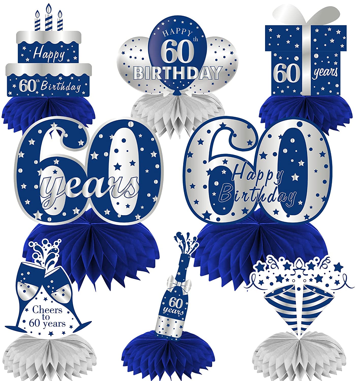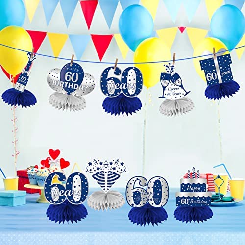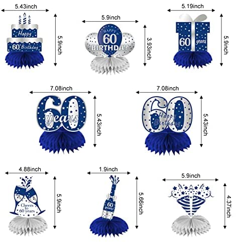 8Pcs Happy 60th Birthday Decorations Table Honeycomb Centerpieces Party Supplies, Blue Silver 60 Year Old Birthday Table Honeycomb Centerpiece Photo Sign Decor