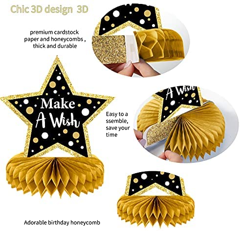 Package: you will get 9 pieces of happy birthday honeycomb centerpieces including stars,cake,balloons , and so on;These birthday table decorations are so chic and funny that make your birthday theme party a big hit. Great size: their sizes are about 6 x 8 inches, add some atmosphere by setting these gold decorations for the birthday party in the middle of the table and these cool black and gold decorations are impressive enough to be noticed. Durable quality: the birthday table centerpieces are made of sturdy card stock with surface laminated and delicate printing technology; These birthday table toppers are sturdy, non-toxic and no odd smell, which are a good choice for your graduation party How to use: Step1, tear off the sticker of the honeycomb ball. Step 2, stick the honeycomb ball to a fixed area on the card. Step 3, repeat on the other side of the card. Step 4,finally put it stand on the table. Its so easy that you can save a lot of time . Great birthday party supplies: these birthday table centerpieces exquisitely designed with interesting birthday elements so that everyone will love these chic designs. Decorating your home and party with our honeycomb centerpieces will be a big hit at your party.