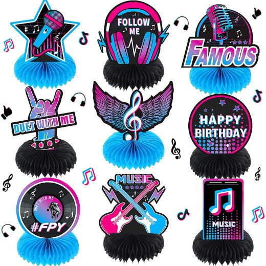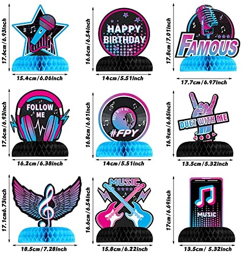 9 pieces music birthday party table decorations honeycomb centerpieces, music paper table toppers signs home room desk decor for music social media themed birthday party supplies Features: Music party table decorations: These paper table centerpieces are designed with assorted patterns, like microphone, guitar, disc, headphone, note, rock gesture, and with related hot words, which can catch the attention of your guests and provide strong festival party atmosphere. Easy to install: Just glue the honeycombs and stick them to paperboard, then you will get the completed centerpiece and the disassembly is also simple and convenient for you. Specifications: Material: card stock, paper Size: as the picture shows Color: as the pictures show Package includes: 9 x Music paper cards 18 x Honeycombs Warm tips: Manual measurement, please allow slight errors on size. The colors may exist a slight difference due to different screens