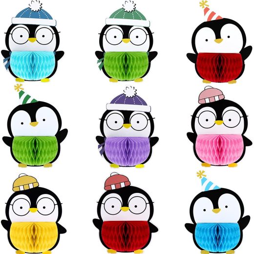 Features: Easy to assemble: You only need a few seconds to complete the assembly according to the pictures, and then place the penguin honeycomb centerpiece in your favorite display area to decorate your dining table. Applicable occasions: These penguin table centerpieces are suitable for animal party, baby shower and birthday party decorations, bringing fun and happiness to your guests. Specifications: Material: thick card paper Color: as pictures shown Size: as pictures shown Package includes: 9 x Penguin honeycomb centerpieces Notes: Manual measurement, please allow slight errors on size. The color may exist slight difference due to different screen displays.