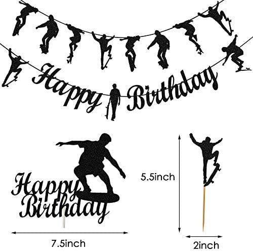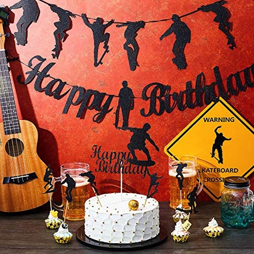 9 Pieces Skateboard Theme Happy Birthday Party Decorations Skateboard Happy Birthday Banner Black Silhouette Cupcake Toppers Skateboard Theme Party Supplies for Boys Girls Adults
