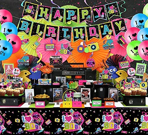 90s Party Supplies – Back to the 90s Party Decorations Set Including HAPPY BIRTHDAY Banner, Hanging Swirls, 90s Element Bunting, Plates, Cups, Napkins, Tableware, Tablecloth, Balloons – Serves 20