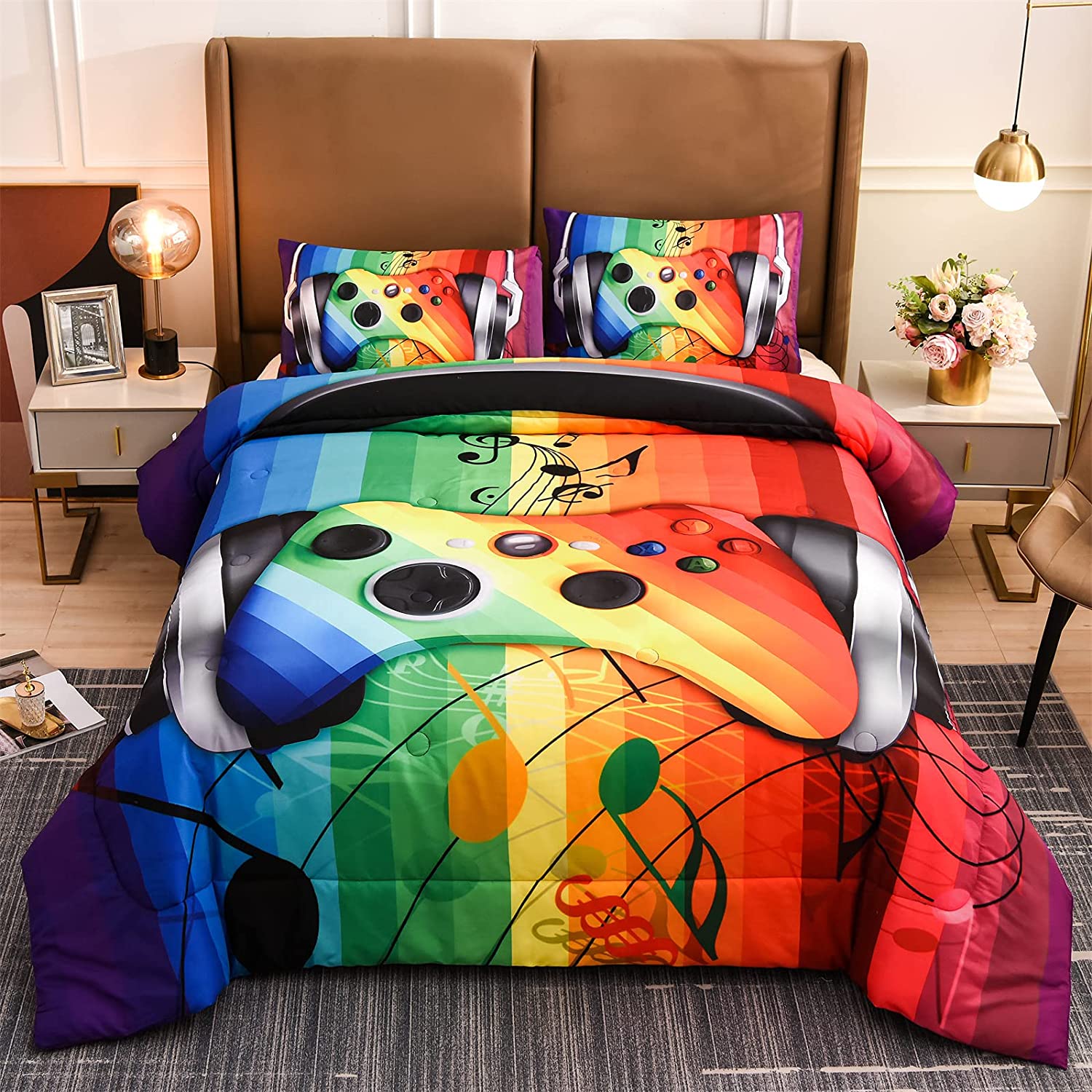 Fashion DesignRainbow Colorful Gamers and Music,Elegant and nice quality gamer comforter set,you be lost in music and game.Make you sleep well all night.Great gifts for boys , girls ,friends , family or anyone who is passionate about games.Decorate your bedroom, guest room, RV,vacation home and dormitory with this lovely 3D kids comforter set,Wonderful Bedding Decor. SetTwin Size Information-Comforter size is 175m*228m(68×88),2XPillowcases sizes is 50x70cm(19.6×28) MaterialSoft microfiber, durable, fade-resistant and machine washable.Microfiber material is cool and breathable, More durable than cotton Easy CareEasy to clean (NO Dogs or Cats hairs pets fur left) Machine wash in cold. Tumble dry low.Fade, stain, shrink and wrinkle resistant. Soft breathable and durable lightweight.More durable than cotton. TipsSince the Comforter is Packaged in a Vacuum Bag, It is Highly Recommend That the Comforter Be shaked a few times in the Sun and Tapped Gently During becoming Fluffy.