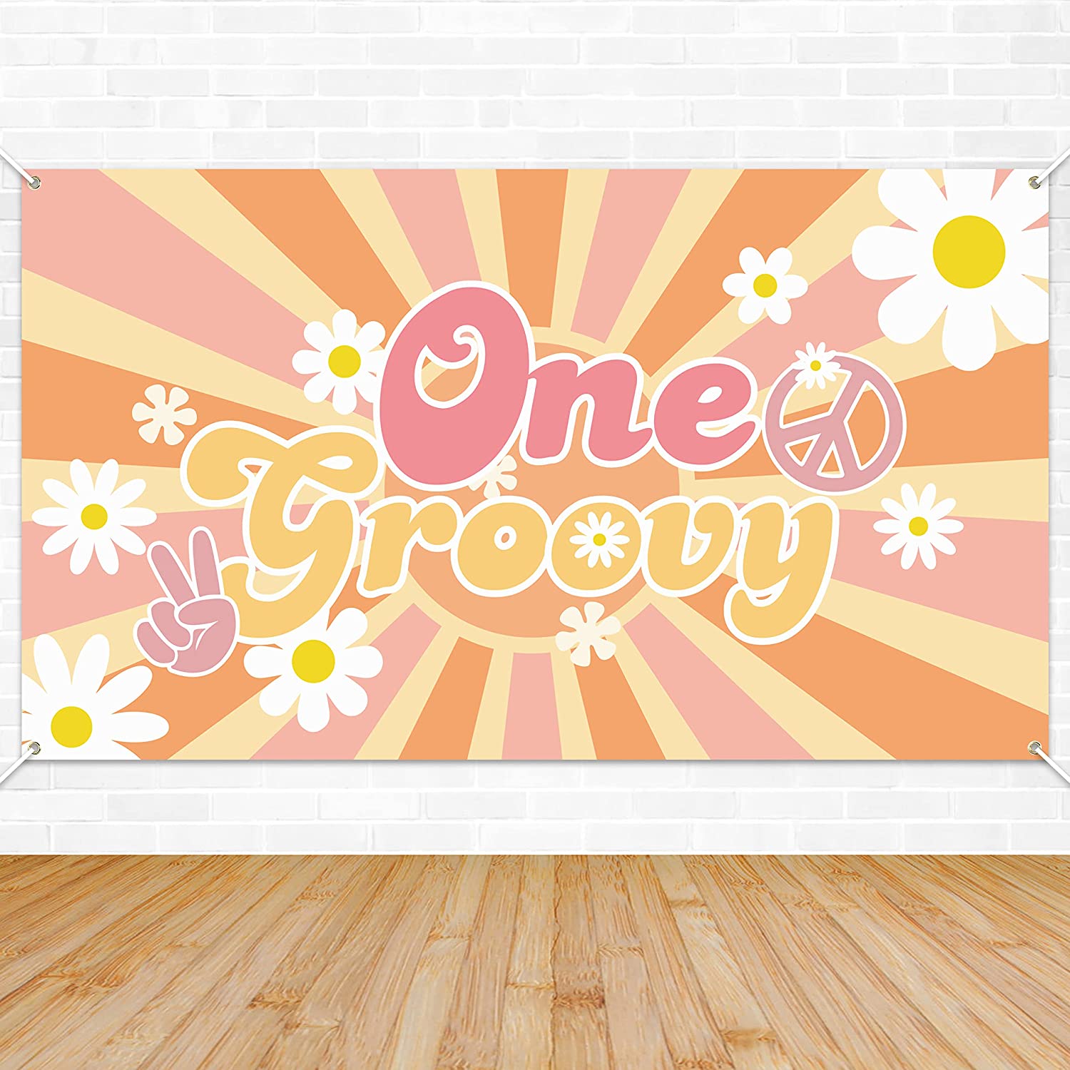 A1diee One Groovy Backdrop Banner Retro Hippie Boho Girl Party Decorations 1st Birthday Party Supplies Daisy Flower One Year Old Birthday Photography Background for Baby Shower Photo Prop Wall Decor
