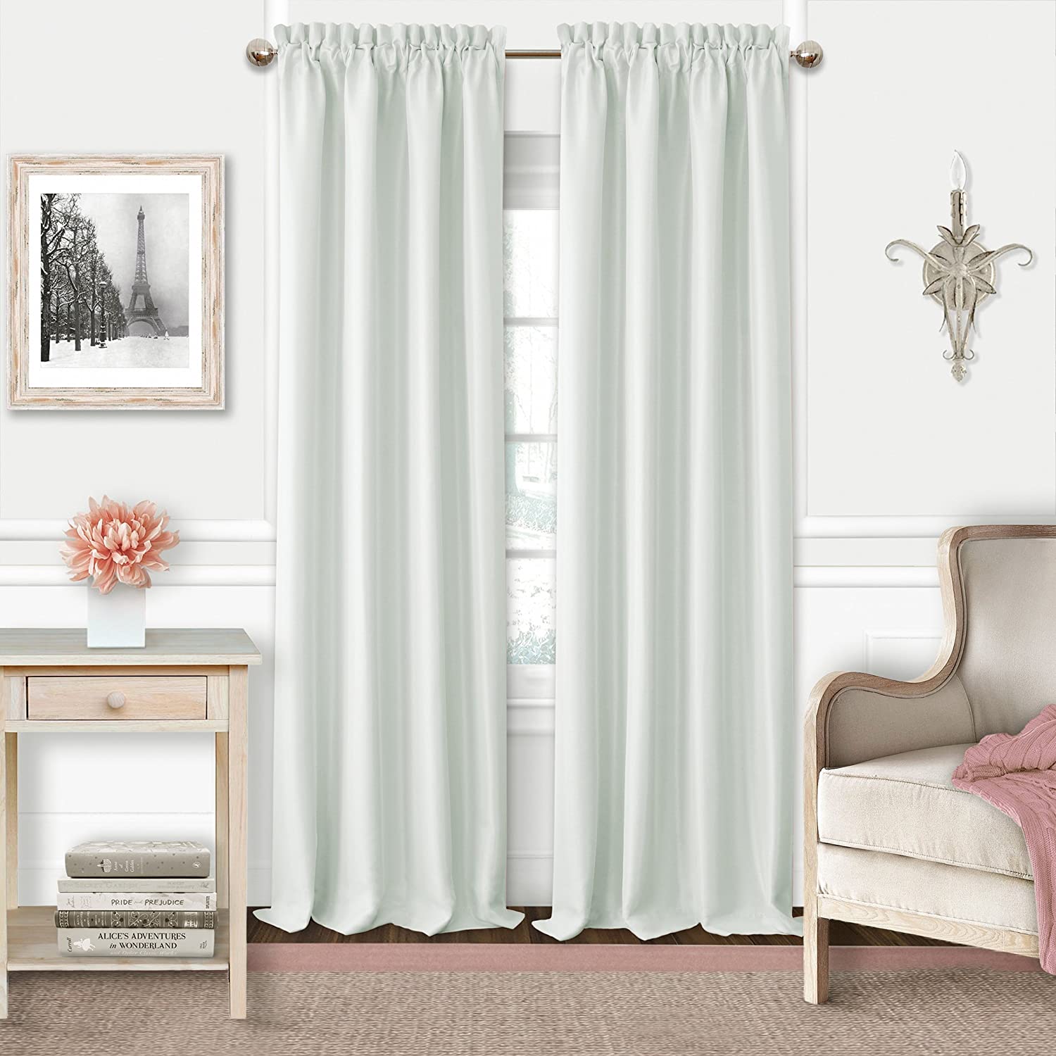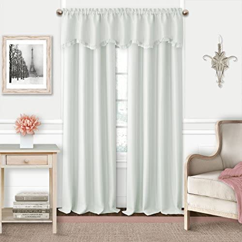 Textured 100% Woven Polyester Blackout Weave Adaline Kids Pastel Faux Silk Solid Color Blackout Room Darkening and Thermal Insulating Window Curtain / Juvenile Single Rod Pocket Panel by Elrene, 52 Inch Wide X 63 Inch Long, Pearl Gray Pastel Colored faux silk textured blackout room darkening and thermal curtain panel is constructed of a specially woven fabric which is the same color on front and back. Blocks light as well as help keep cold out in the winter and heat out in the summer, Great For Children and Adults. Each rod pocket curtain panel is sold individually, 3 inch deep rod pocket suitable for decorative and 2 Inch continental curtain rods on each panel allows easy installation. Hang the Adaline panels alone or pair them with the ruffle edged matching Adaline ruffled scallop valance. Panels are sold individually. Valance is sold separately. Main Image shows 2 panels and 2 valances 100% polyester fabric. Machine wash cold in gentle cycle with like colors. Use only non-chlorine bleach when needed. Tumble dry low. Cool iron as needed.
