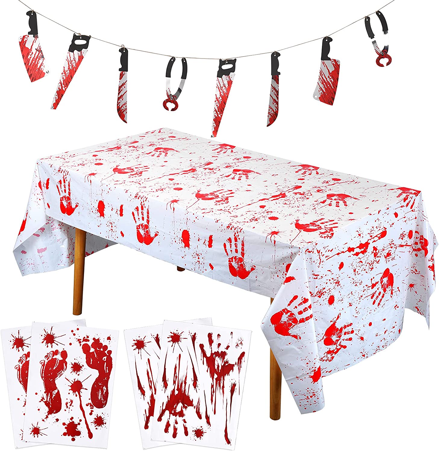Adeeing Halloween Party Decorations Set, Bloody Knife Garland Banner, Bloody Tablecover, Footprints and Handprints Window Stickers for Haunted House Zombie Vampire Birthday Party Supplies
