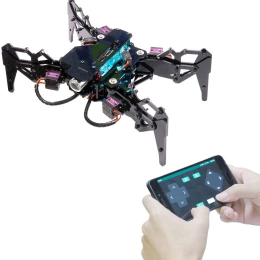 STEAM Educational Robot – A complete Bionic Quadruped Spider Robot Kit based on the Raspberry Pi(Compatible with RPi 3B/3B+, Raspberry Pi is NOT included). Object Recognition, Tracking, Motion Detection – based on openCV; C/S Architecture – can be remotely controlled by GUI APP on PC; WS2812 RGB LEDs – can change a variety of colors, full of technology; Real-time Video Transmission.