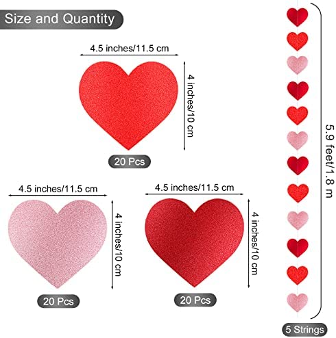 Specifications:Size: 4 x 4.5 inches/10 x 11.5 cm (each flag)Color: burgundy, red, pinkPackage includes:5 strings x heart garland banners (each consisting of 12 pieces flags)Note:Please allow a slight difference in color due to different monitor displays