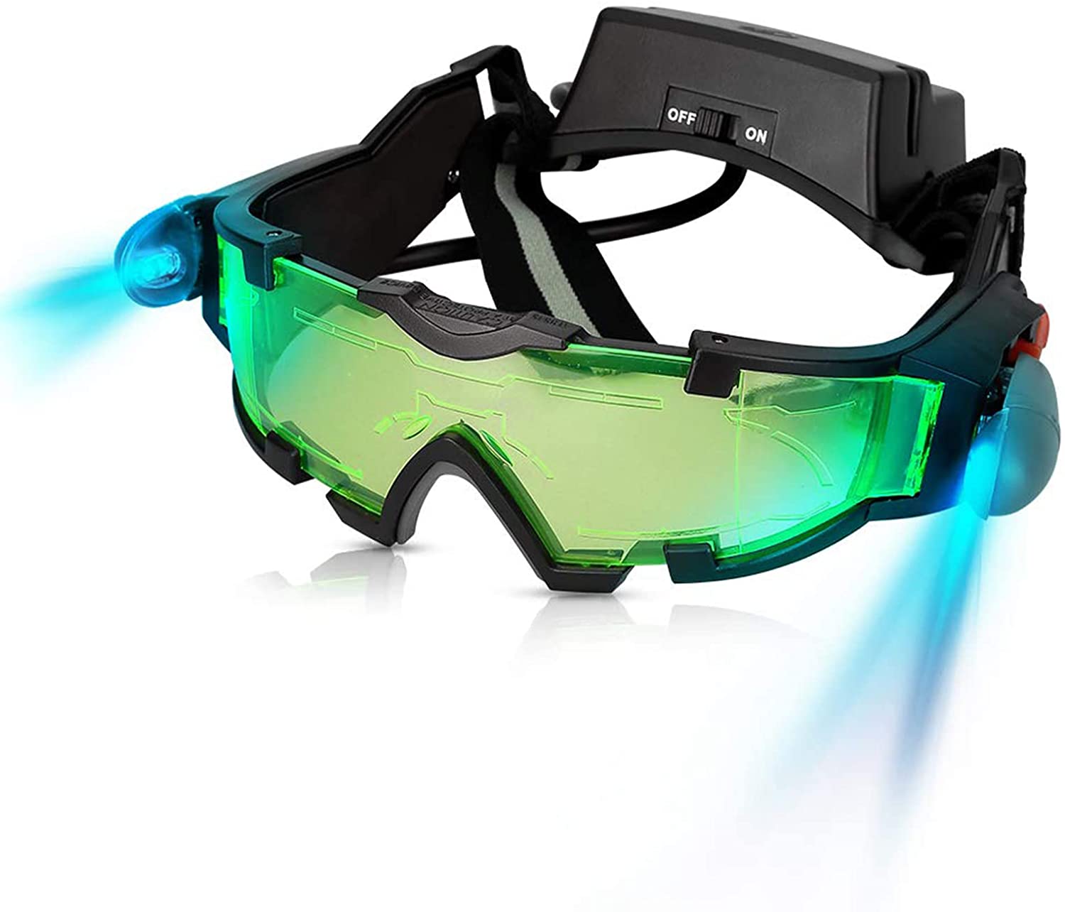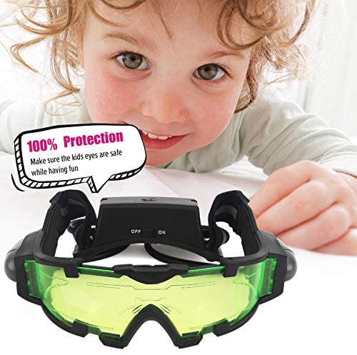 Just Throw Away Uncomfortable Goggle ! We know youre searching a comfortable but cool goggles for your kids.AGM spy night vision goggles is your choice.This night vision goggle is designed for a comfortable fit, very comfortable nose pad and adjustable elastic bands make kids get rid of the uncomfortable feeling when wearing glasses.Power: 4x AAA batteries (Not included). See In The Dark 25 Feet ! This spy night vision goggle can pop out lights that beam a cool blue light, let you see up to 25 feet away in the dark. Amazing night vision goggles make your kids never want to take off it .LED lights do not need replacing, SO COOL !The child would be like it ! Suitable For Night Activities This kid night vision goggles with flip- out LED light are used for night activities.Wearing this LED night vision goggles will make your kids becomes the center of attention, you can discover your kids in the dark easily for its LED light. Protect Childrens Eyes Not only used as night lighting, but also it could be protect Childrens eyes when theyre having fun. This protective goggles is ergonomic design, wide vision and safety to wear. Attentive serviceIf you have any problems, please do not hesitate to contact our friendly support team!