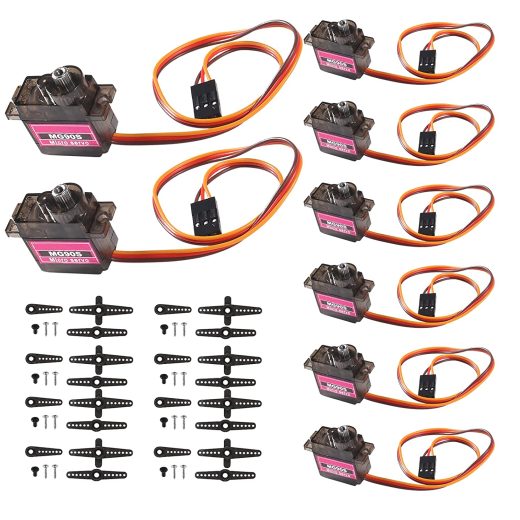 Product Model : MG90S Maximum Angle :180 degrees Operating Voltage : 4.8V Operating Speed : 0.11 seconds / 60 degrees Temperature Range : 0 — 55 The dead-band setting : 5 microseconds Line Length : 300MM Control system : Change the pulse width Amplifier type : Analog controller Plug Type : JR, FUTABA General Package includes: 8 x MG90S 360 degrees micro servo 8 x Servo arms and screws set