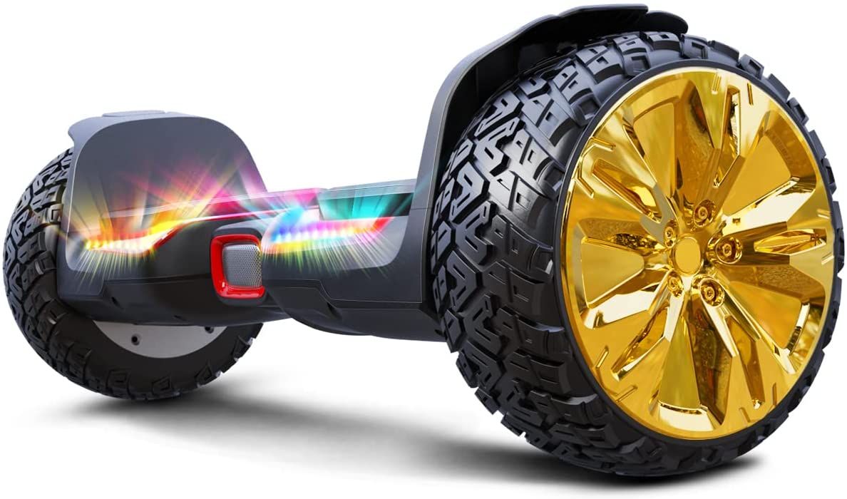 All Terrain Hoverboard -Powered by strong 350W dual motors and 8.5 inch off-road solid rubber tires, this Y1 Pro hoverboard all terrain can ride on grass, dirt, gravel and other rough surfaces, also ride up-hill up to a 30° slope. 4000mAh Large capacity battery, support riding 11 miles per full charge, maximum speed 10mph.