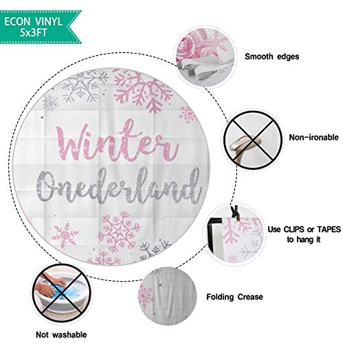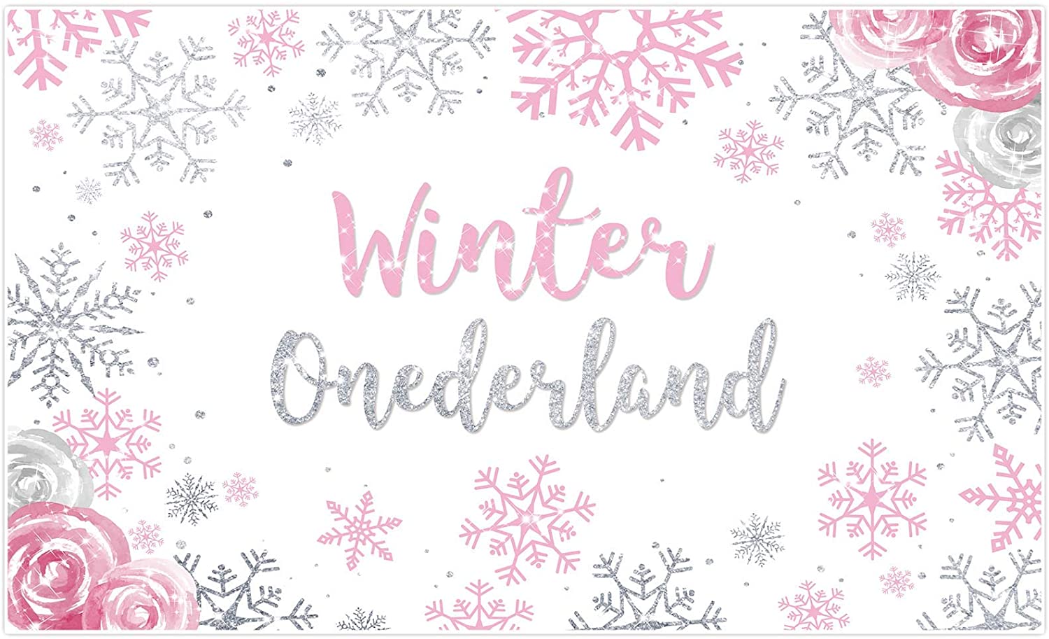 Allenjoy 5x3ft Winter Onederland Backdrop Pink Silver Florals Snowflakes Photography Background for Kids Girls Baby Shower Happy 1st Birthday Party Cake Table Decor Banner Photo Studio Booth Props