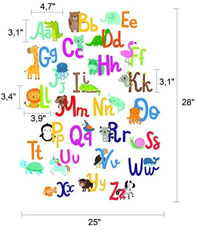 FUN LEARNING: With our colorful ABC Wall Stickers learning your childs will turn into a fun activity. Make early education joyful and easy with these 27 brightly colored Baby Wall Decals! NURSERY DECORATING: Add bright colours to your toddlers room with no tools, no glue and no hassle. Transform your boy or girl nursery into a happy place for playing and growing with Animal Toddler Wall Décor EASY PEEL and STICK: These Alphabet Childrens Wall Decals can be applied to any smooth surface, including walls, furniture, windows, doors, mirrors or any thing else you can think of. Each element is pre-cutted and easy removable from the backing. Simple way to create a joyful environment in classroom, nursery or daycare area HIGH QUALITY Baby ABC Stickers for Wall: Alphabet Decals are made from high quality Eco-Friendly, durable and 100% safe Vinyl. Carefully designed by DesignStickers illustrators to achieve the best quality for the affordable prices for your and your kids long experience! 100% risk FREE PURCHASE! We would like to meet all your expectation with our Decals ABC Letters for kids rooms and offering you an unconditional money back quarantee in case we failed to meet your demand. Place your order now and ENJOY!