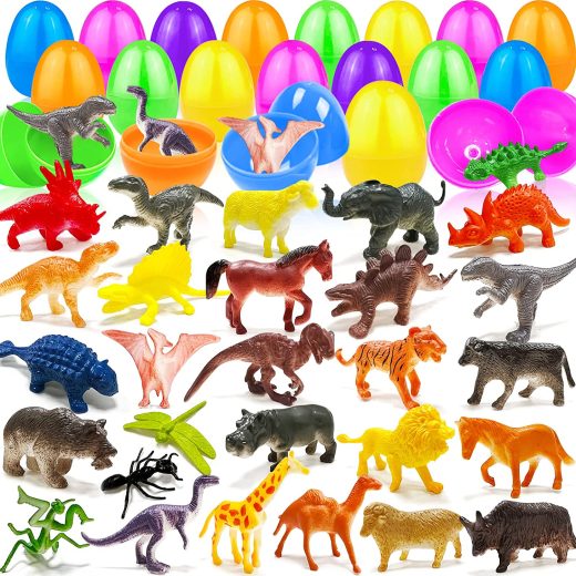 48 Different Animal Toys Filled Easter Eggs:Dinosaur toys theme: Tyrannosaurus Rex, Triceratops, Stegosaurus, Flying Dragon, Spinosaurus, Brachiosaurus, Ankylosaurus, Brontosaurus, Pachycephalosaurus, Tyrannosaurus, Domeosaurus, Allosaurus, Xunlong, Ctenosaurus.Farm animal toys theme: cock, hen, cow, puppy, goat, duck, horse, little sheep, big dog, cow, white rabbit, big sheep.Insects theme: centipedes, dragonflies, crickets, vegetable bugs, ants, spiders, scorpions, cockroaches, mantises, beetles, stick insects, hornworms.Beasts theme: Tiger, Lion, Bear, Rhino, Camel, Giraffe, Hippo, Antelope, Horse, Goat, Yak, Elephant. Specifications:Easter Eggs size: 2.6*1.8 inch (height*width).Lion: 2.4*1.4 inch (length*height).Cows: 2*1 inch (length*height).Dragonfly: 2*2.6 inch (L*W).Tyrannosaurus rex: 2.6*1.2 inch (length*height).Easter Egg color: blue (9) + pink (7) + green (8) + yellow (8) + orange (8) + purple (8).Animal Toy color: colorful.Material: PVC.Suitable for 3 years old and up.Widely usage: Easter party favors, Easter eggs hunt, birthday parties, gifts, goodie bag fillers, carnival prizes, classroom rewards.Package Includes:48 x Easter Eggs Filled with Different Animals Figures toys