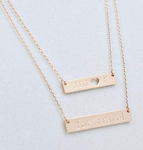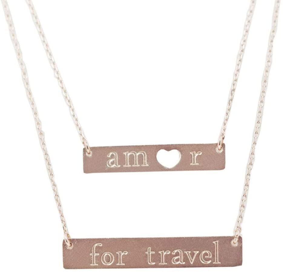 Travel in style with this Amor for Travel double bar stamped rose gold necklace. It includes a cutout heart shape which gives it an extra feminine touch. An easy to pack fashion statement accessory that is bound to coordinate with any outfit.