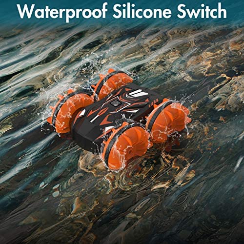 Amphibious Cool Stunt CarDifferent from other remote control cars, this one not only conquers land, but also water. Uniquely designed silicone ON/OFF switch on the car body plus well-sealed waterproof outer shell ensures your limit-free play. Widely applicable in such occasions including concrete land, grassland, sand, lake, sea, swimming pool and more.