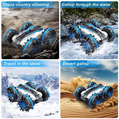 360°Rotating & Double Sides Running Car – The off road stunt car can flexible do amazing 180° flipping and 360 ° rotation. Just bump it against a wall or stop quickly to cause it to flip over, provide you the thrilling visual experience. 4WD amphibious RC car supports it break through land, sandy beach, mud, grass or sea easily!