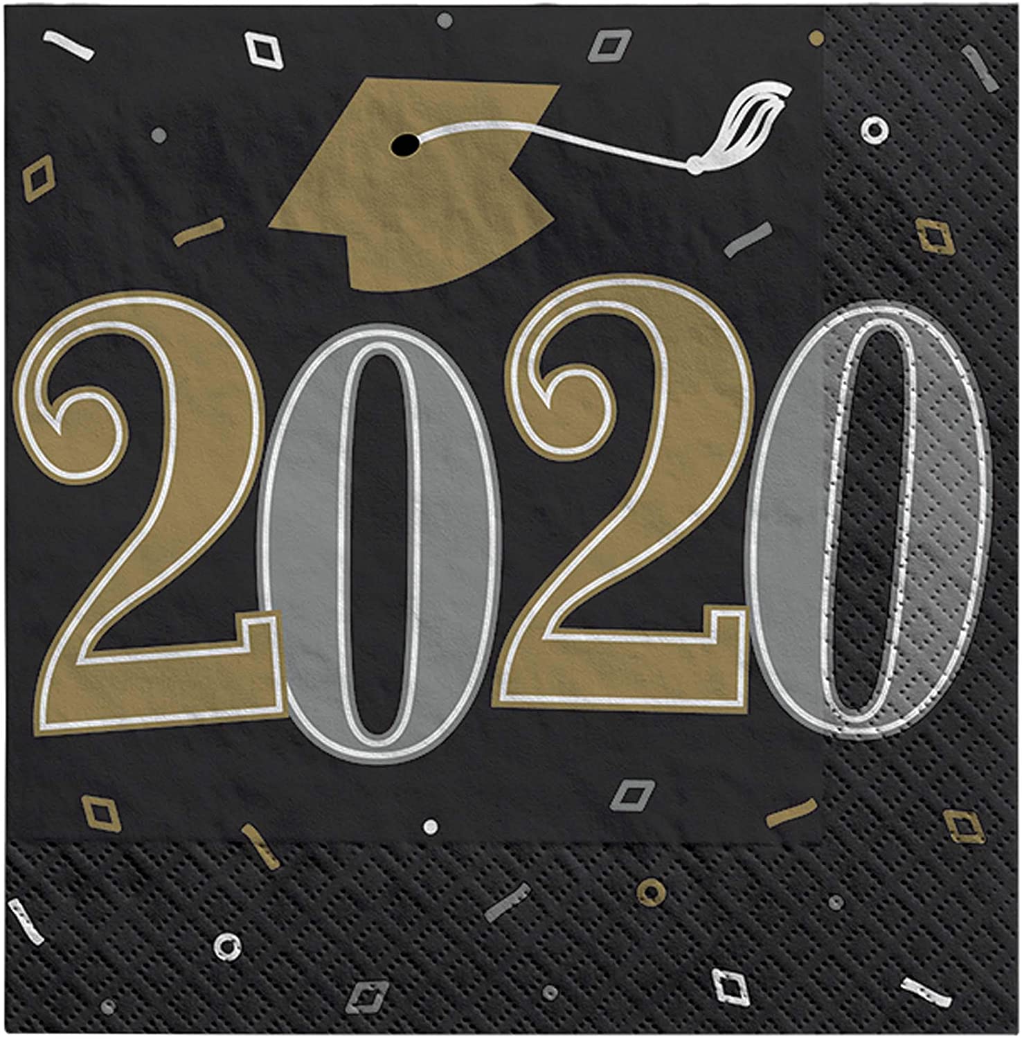 Amscan 2020 Grad Paper Beverage Paper Napkins, Black, Silver and Gold, 36 pc