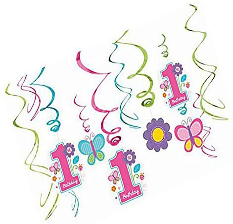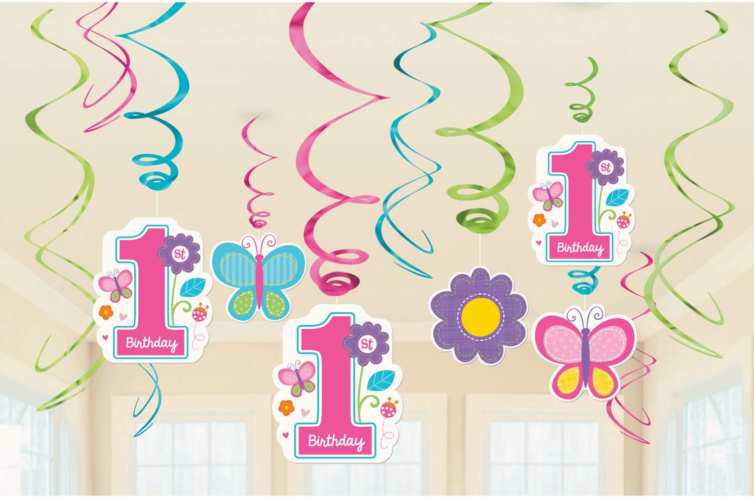 amscan Foil Swirl Decorations | 1st Birthday Girl |Flowers and Butterflies Collection, 12 Pieces, Multicolor