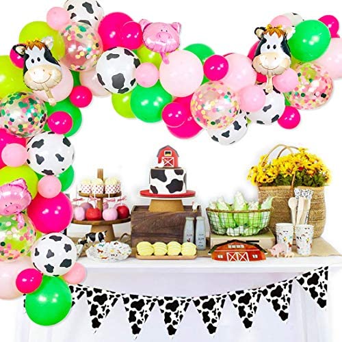 UNIQUE IDEA- Our farm animal balloon garland with mini pink pig and cow foil balloon, 12 5 fruit green, pink, light rose red, green, cow print, far…