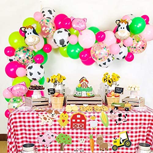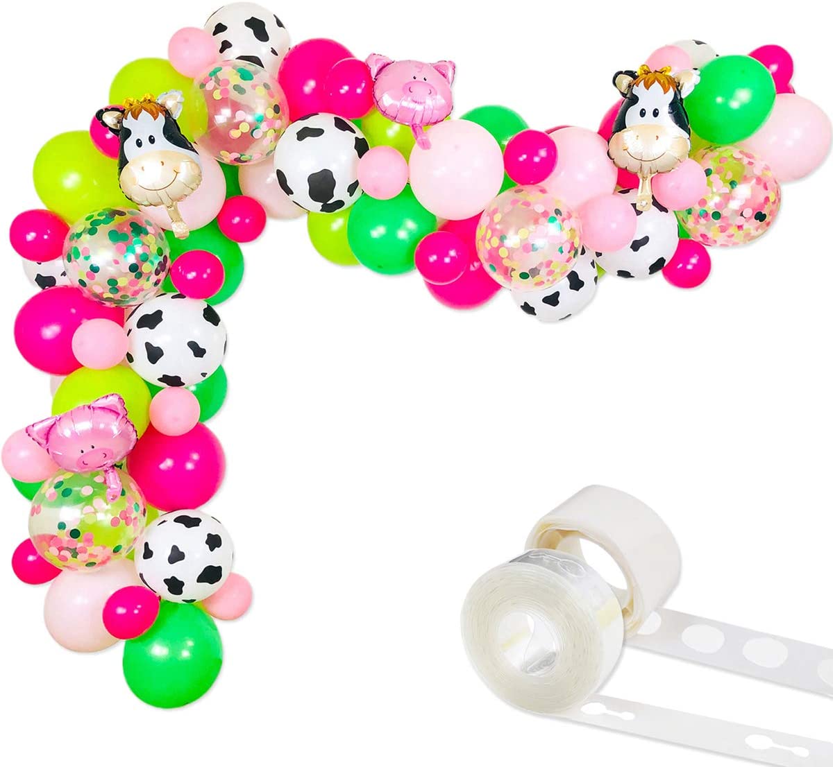 Animal Farm Balloon Garland & Arch Kit, 79 Pack 12Inch 5Inch Cow Print, Green, Pink, Light Rose Red Latex Balloons Confetti Balloon Pig Cow Balloons Strip Set for Kids Farm Birthday Party Supplies
