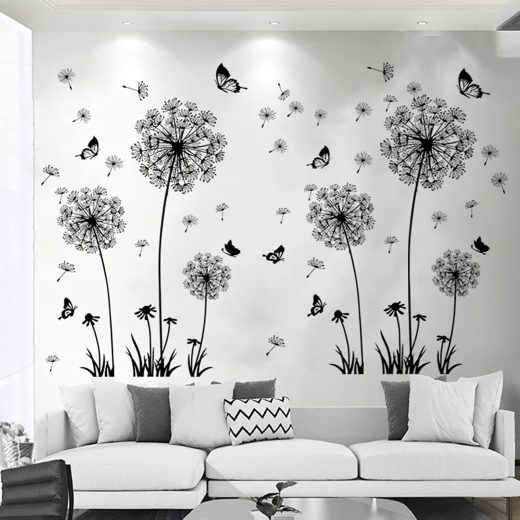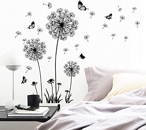 Arawat Dandelion Wall Decals Stickers for Bedroom Wall Stickers & Murals Living Room Floral Wall Decals Flower Black Butterfly Nursery Room Decor Removable Nature Wall Art Decorations Peel and Stick