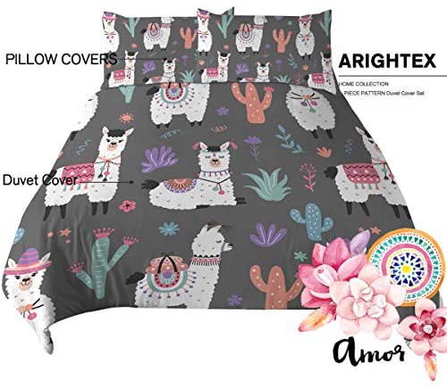 ARIGHTEX Llama Bedding Twin Set for Kids Girls Llama Duvet Cover Grey Boys Llama Cactus Bed Set Boho Cartoon Alpaca Comforter Cover with 2 Pillowcases (Twin)
