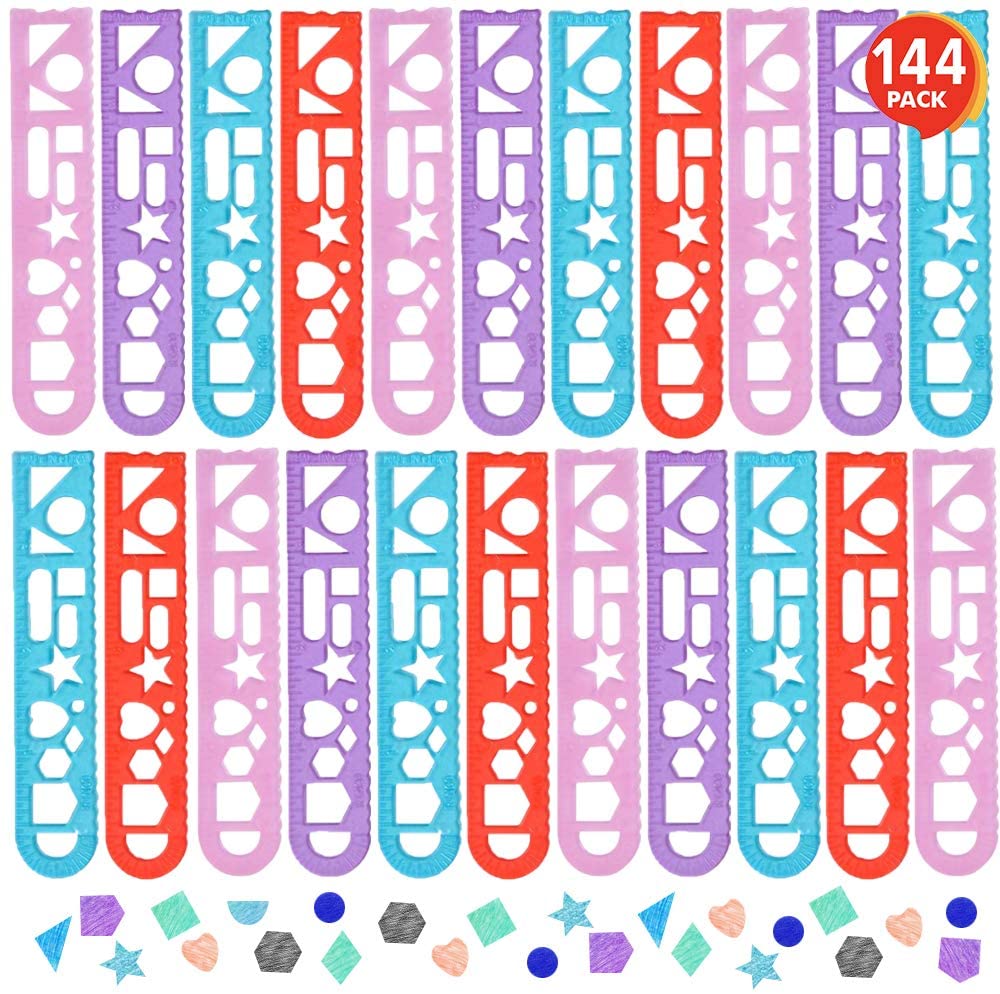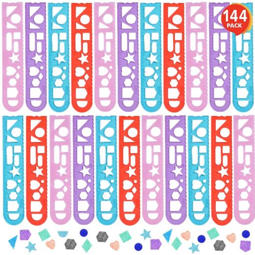 EDUCATIONAL TOOLS THAT INSPIRE LOTS OF FUN Keep them Busy Sharpen little minds while sparking huge smiles! Great for ages 5 and up, these tracing rulers keep kiddos busy for hours as they draw, trace, and let their imagination run free. Each 4.25” ruler can be used for measuring, or for drawing everything for stars, diamonds, hearts, to all the basic shapes; great for familiarizing younger students with all manner of shapes. And the best part of it all Every pack comes with 144 tracing rulers to give your buck and a very big bang! Get to make the day of tens of little ones without breaking the bank.Great for Gifting Whether you’re looking for birthday party favors for your little one’s bash, unique party supplies, prizes for that kids’ carnival or contest, good behavior incentives, back-to-school gifts, or classroom teacher rewards, these tracing rulers are guaranteed to be a hit! Every pack not only comes with 144 rulers to give you enough to dish around but also a 100% money-back guarantee to give you total peace of mind. Inspire a rush of smiles and giggles without having anything to lose.Heres why you’ll love these tracing rulers: Come in a set of 144 to give you great value.Includes an assortment of pink, purple, blue, and red.Can be used as a ruler or a shape tracer for hours of fun.Measure 4.25” to fit into goodie bags or holiday stockings.Great as party favors, treats, and gifts for ages 5+Backed by a no-hassle, 100% money-back guarantee.Go ahead, give the kids something to smile about with treats they’ll relish!