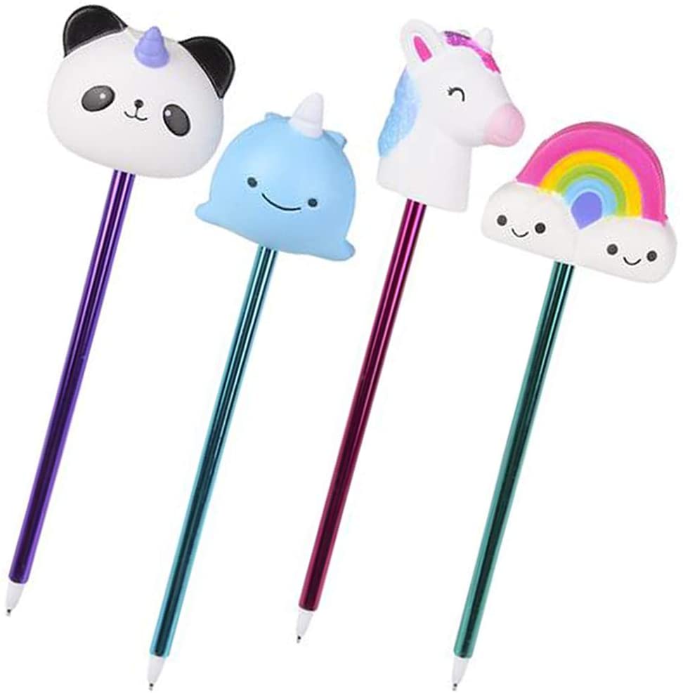 ArtCreativity Squeeze Magical Pens, Set of 4, Cute Pens for Kids and Adults with Squeeze Toy on Top, Stress Relief Fidget Pens, Fun Stationery Party Favors for Boys and Girls, Assorted Designs