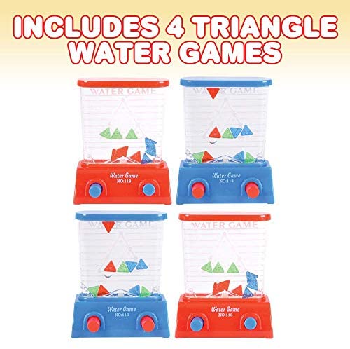 RECIPE FOR HOURS OF SOOTHING, ENTERTAINING FUNClassic GoodnessOn the road or in the house, these handheld water games for kids are just what you need to keep little minds busy and adorable faces smiling! Every set comes with 4 water games that calm, soothe, entertain, and keep boredom at bay. But these aren’t your regular water games. While others feature rings, these stand out with colorful triangular pieces waiting to be manipulated. Press the buttons on the sides with the aim of building a pyramid by placing the triangles in the correct position. Boys and girls ages 3+ will love them!Great for GiftingWhether you’re looking for party favors for your little one’s birthday party, unique goodie bag fillers or stocking stuffers, prizes for that kids’ carnival or contest, or fun rewards for children, these triangle water games are guaranteed to be a hit! Every pack not only comes with 4 games to give you enough to dish around but also a 100% money-back guarantee to give you total peace of mind. Inspire a rush of smiles and giggles without having anything to lose.Here’s why you’ll love these triangle water games: Come in a set of 4 to give you great value. Includes 2 red and 2 blue games for beautiful assortment. The water game is easy to use by kids ages 3+ Perfect as party favors and gifts for boys and girls. They don’t need any batteries to operate.Portable 4” size makes them great road trip travel toys. Backed by a no-hassle, 100% money-back guarantee.Have the kids smiling from ear to ear with the coolest gifts!