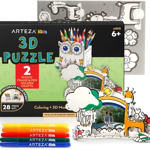 Arteza Kids 3D Puzzle, Owl & Giraffe to Craft, Photo Frame & Pen Holder Model Kit with 23 Foam Pieces, 5 Nontoxic Markers, and Easy-to-Follow Instructions, Art Supplies for Kidsu2019 Activities