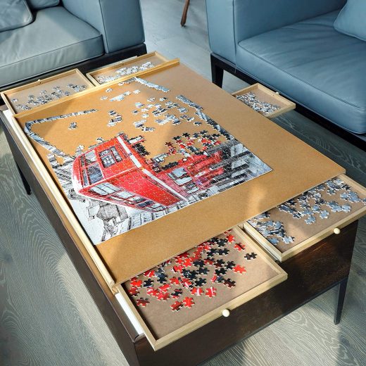 Solid & Stable: This jigsaw puzzle board is made of sturdy MDF wood for long term use. Sealed with lacquer finish to prevent warping. The wooden fence can prevent puzzle falling out, wood tones may vary. Jumbo Size: This puzzle table with drawers work space measures 26.4 x 35.4 and fits most 1500 pieces puzzles (puzzle sizes may vary). Safe Jigsaw Puzzles Organizer: Unique sorting, assembly, and storage system for jigsaw puzzles, keep your unfinished puzzles safe until next time. Large Storage Space: This puzzle storage board has five wooden-reinforced sliding drawers to sort and store your similar color puzzle pieces in 5 areas. Great Gift Idea: Place the wooden easel on a table or counter, and instantly have a surface to work on your puzzle, makes this jigsaw puzzle table a special puzzle accessory gift for Christmas, birthday, anniversaries, Mothers Day, or as an anytime present!