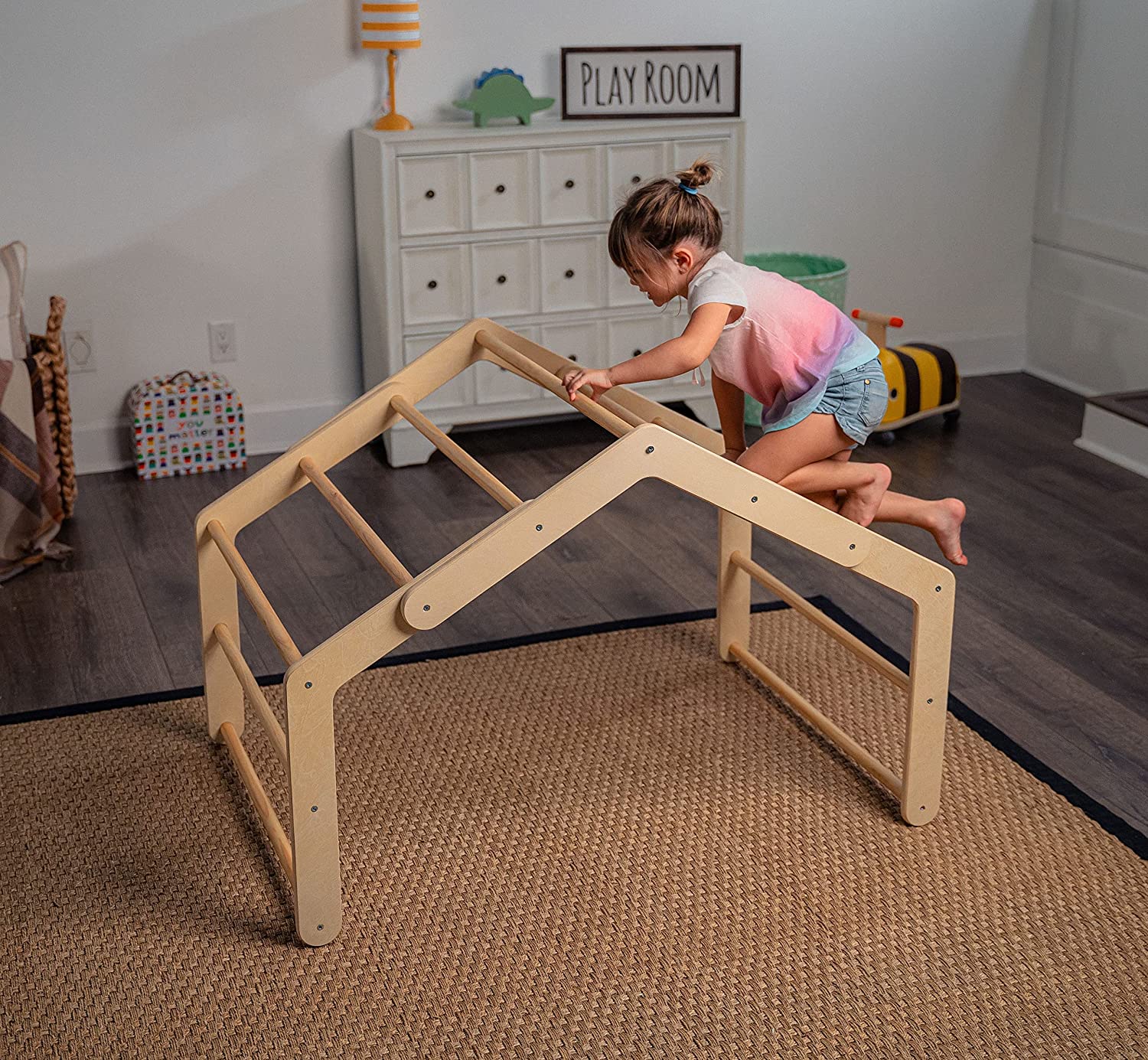 TRANSFORMABLE INDOOR CLIMBING – Triangle Tent Playhouse is created similarly to Waldorf toys and Montessori furniture principles to develop balance control, motor skills, courage, etc. It is a great simulator for the whole body. Climber gym playhouse which will be a perfect gift for kids from 1 year to 5 years old. POLES ARE MADE FROM NATURAL PINE WOOD – Tent Play tent features 2 windows inside. The tent is made from 100% cotton. Poles are made from natural pine wood. Every child will love their own Kids Tent. They can reading, acting and Cosplay with friends inside of her or his Play Tent, letting your kids personalize their Kids Teepee Play Tent, develop their imagination in the decoration of their little home. CAN BE USED INDOORS & OUTDOORS – In dry weather on the soft surface EVERY CHILD WILL LOVE THEIR OWN KIDS TENT – They can reading, acting and Cosplay with friends inside of her or his Play Tent, letting your kids personalize their Kids Teepee Play Tent, develop their imagination in the decoration of his little home. ENCOURAGING DISCOVERY THROUGH MOVEMENT – This Montessori inspired climbing frame is perfectly designed for little climbers. The climbing frame enhances gross motor skills, strength, body coordination and confidence. SAFE, STURDY & RELIABLE EQUIPMENT – Our kids indoor play equipment is carefully designed for safety. It is made from industrial grade wood that uplifts its quality and makes it sturdy and robust. : If the lack of parks nearby or your overprotectiveness hinders your childs outdoor playtime, get this indoor slide set to convert home space into a healthy and safe recreational facility. CONVENIENT ASSEMBLY – Easy assembly makes this indoor gym / indoor playground set an ideal pick for you and the kids.