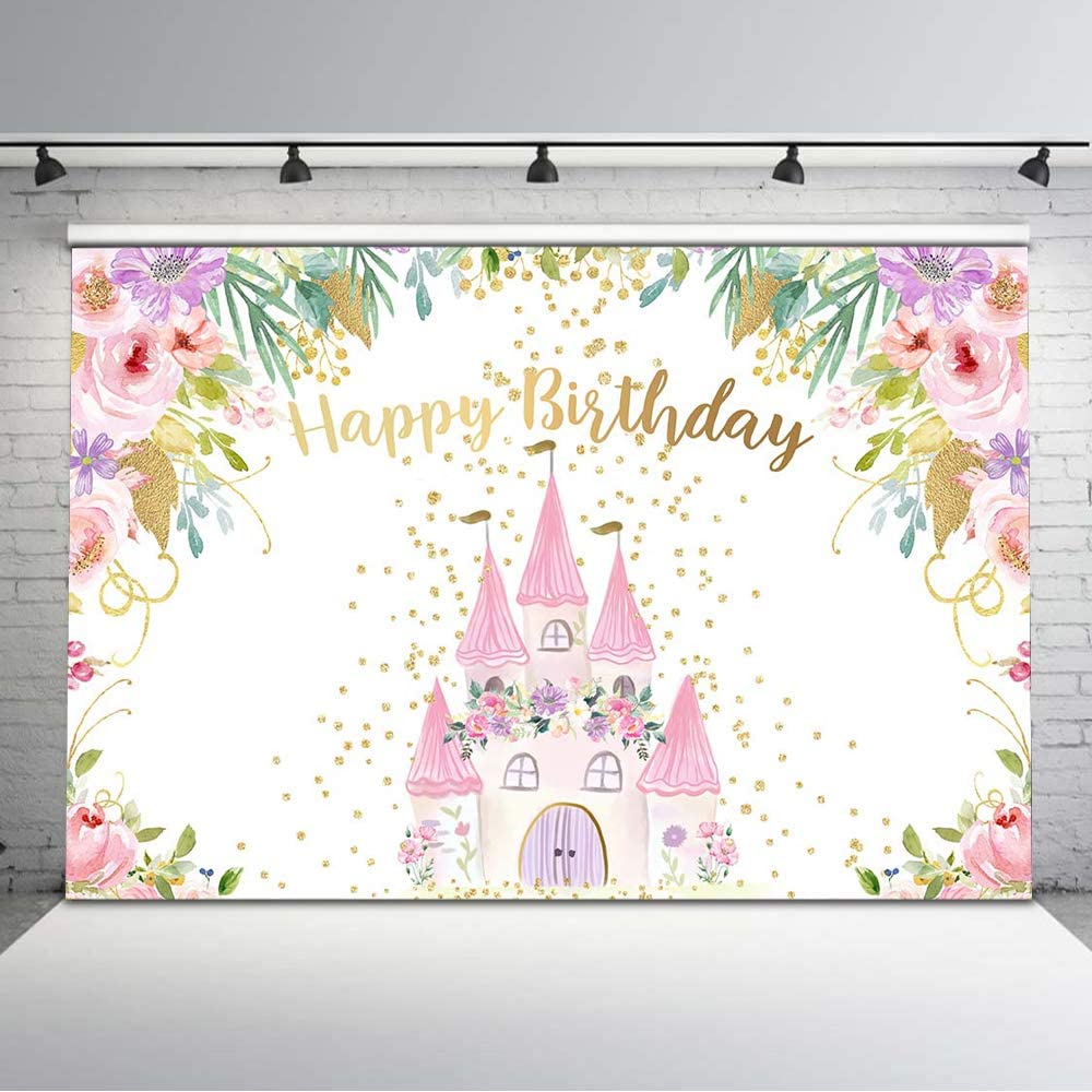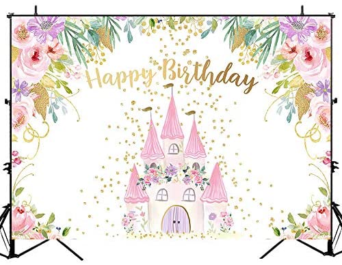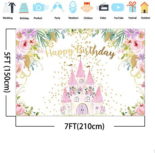 Avezano 7x5ft Castle Birthday Backdrop Flowers Once Upon a Time Princess Birthday Decorations Banner Fairy Princess Gold Dots Castle Birthday Party Background Supplies for Girls (7×5)