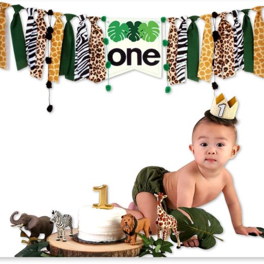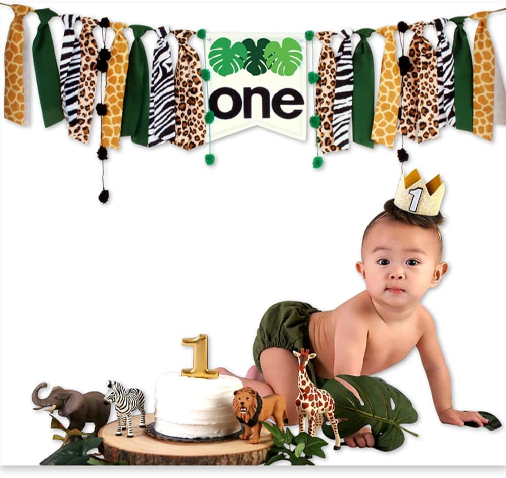 Baby First Birthday Banner – Jungle Animal Theme High Chair Pull Up Banner Baby Birthday Party Decoration – Photo Booth Props (Green)