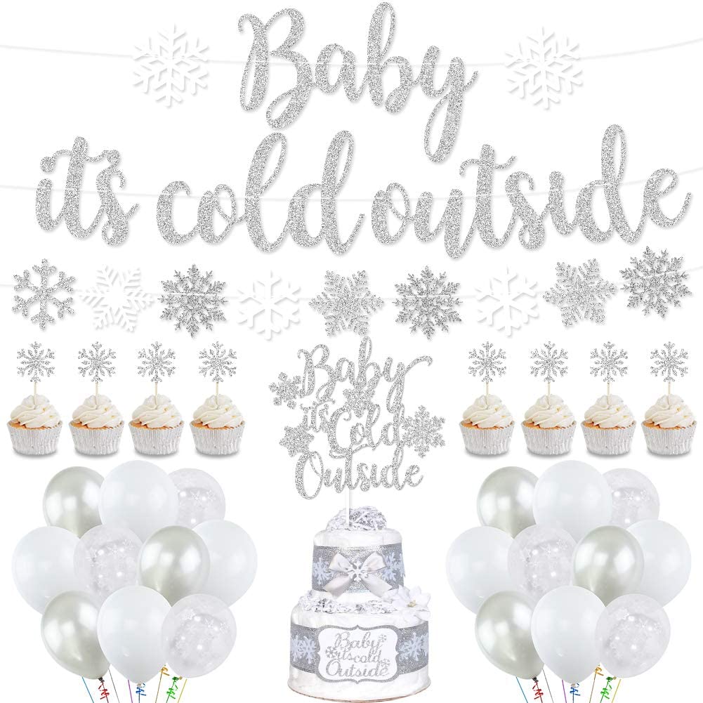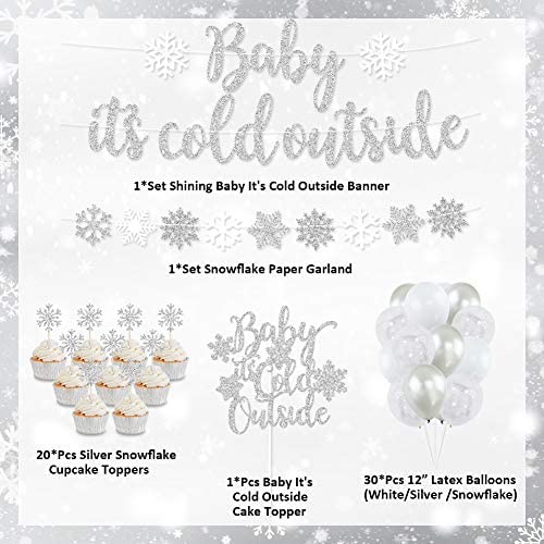 Baby Its Cold Outside Gender Reveal Party KitsPackage includes 1 silver glitter baby its cold outside banner, 1 snowflake garland, 1 baby its cold outside cake topper, 30pcs latex balloons(10 snowflake, 10 white, 10 silver) and 20pcs silver snowflake cupcake toppers. This party pack includes everything you need on a winter gender reveal party. Winter BannerThe length of banners measures about 4ft long, perfect for hanging from branches and ceilings, home,windows,or open against a wall, hanging up dessert tables, backdrops, and the overall party space, the adornment of the integral collocation of color is also very perfect place you want to decorate. Premium MaterialThe banner and snowflake garland was made by high-grade silver glittered card-stock. No odor, no toxic, and can be used repeatedly. The cake topper measures about 7 wide and 10 tall, perfect size for 1-2 pound cake. Gorgeous Addition to Winter PartyWinter is an incredible season for any party. With so many winter party ideas, this baby its cold outside party favor set is perfect for baby shower, winter wonderland, gender reveal, mommy to be or any winter festive events. Quality Assurance!If you are unsatisfied with your purchase of the winter wonderland baby shower decorations kits, you can have a 100% refund without conditions. So love it or your money back!
