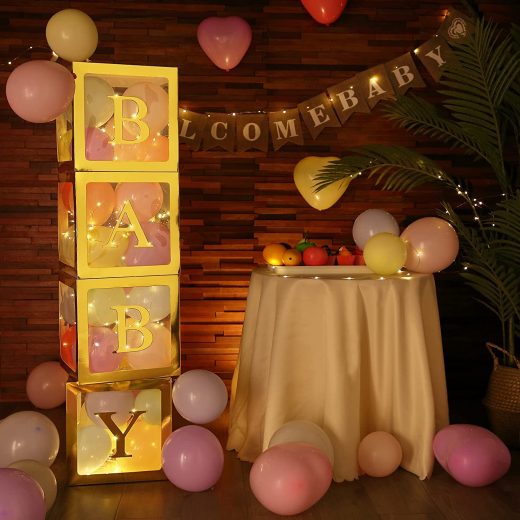 Complete set: you will receive 4 pieces clear balloon boxes, 4 pieces decorative thick cardboard letters [B], [A], [B], [Y], 8 pieces double-sided sponge tapes, 32 pieces random rainbow latex balloons and 4 pieces LED string lights, nice combination for you to decorate or replace in daily life or party Light up baby shower decor: you can paste the thick cardboard with letter [B], [A], [B], [Y] on each transparent balloon box, and put LED copper wire lights and balloons into the box, also you can hang starry string lights on the wall or decorate photos, convenient for you to adorn as your preferences and needs, which can catch peoples eyes at the party Easy to assemble: these transparent balloon boxes and cardboard letters come apart, you can paste letters to balloon boxes separately with double-sided sponge tapes, and then blow rainbow latex balloons, also string lights are equipped with button battery, easy for you to build a beautiful baby shower party decoration scene Safe and strong material: these baby shower decoration boxes are made of durable paper and quality PVC, non-toxic, sturdy and wear resistant, not easy to deform or break, and the light strings are made of copper wire that will not overheat after a long time usage, safe for you to use, moreover, compact in size and light weight, portable for you to carry and store Size information: each clear balloon box measures approx. 11.8 x 11.8 x 11.8 inch/ 30 x 30 x 30 cm, each LED string light measures approx. 4.9 feet/ 1.5m in length and the colorful balloon can be blown to maximum size approx. 5 inch/ 12.7 cm, proper size for you to use