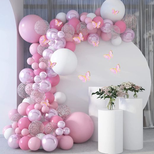 Butterfly Birthday Decoration Total are 130 pcs. 117 pcs latex balloons: 18 inch baby pink and white balloons, 12 inch rose gold confetti and light…